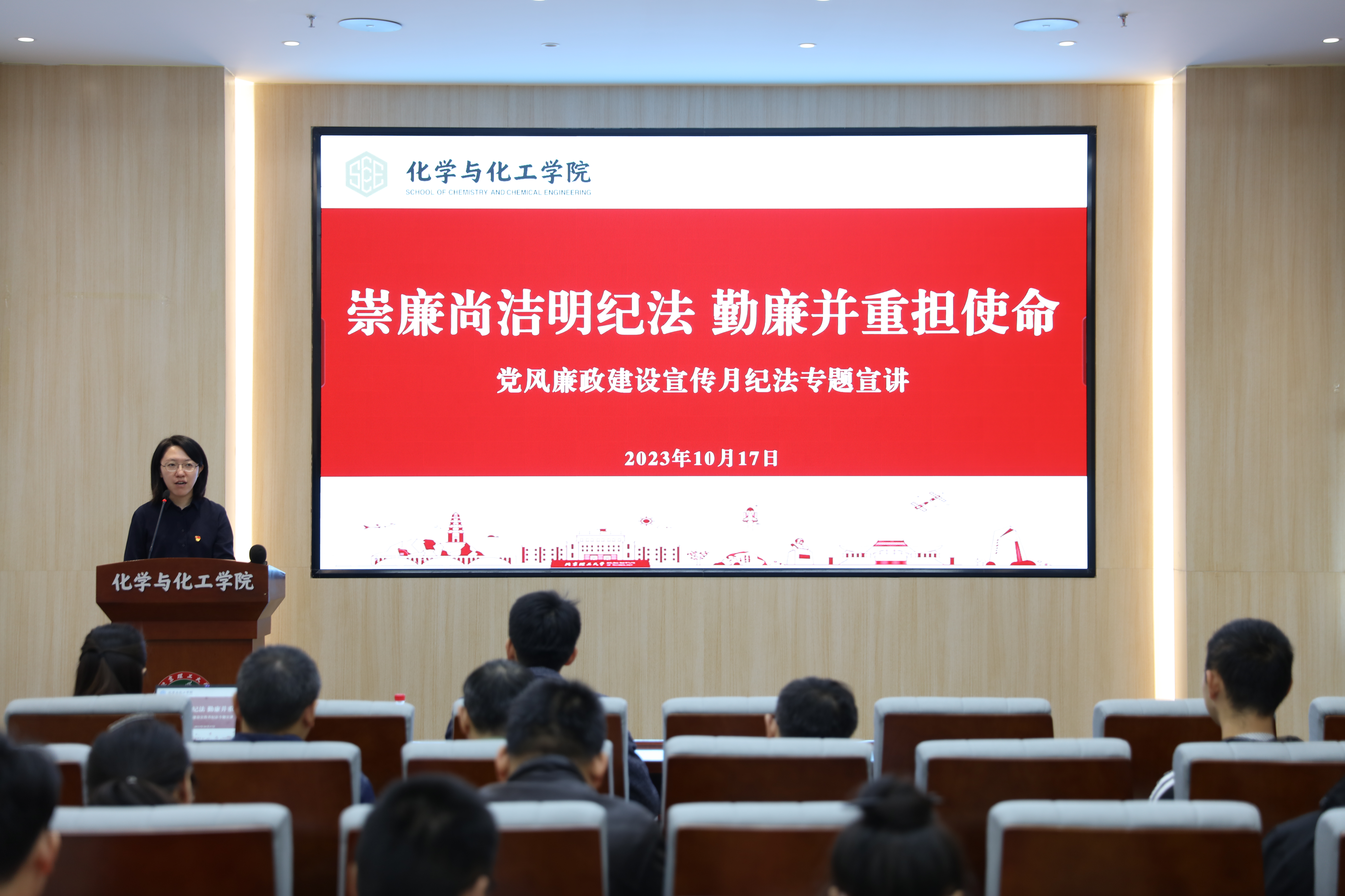 10月17日上午,学院党委邀请纪委第一监督检察室主任胡雪娜为全体党支部纪检委员做纪法专题宣讲。胡主任介绍了开展党风廉政建设宣传月的目的与意义。为大家梳理了相关的纪与法,并通过生活中的真实案例详细解读了《中国共产党纪律处分条例》和《中央八项规定》。在教育全体师生知敬畏、存戒惧、守底线的同时,希望大家保护好自己与身边人的利益。