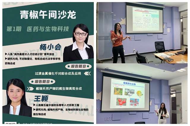 首先杨小会老师进行了题为《过渡金属催化不对称合成及应用》的主题汇报,着重介绍了基于高效不对称合成新反应和新方法建立手性天然产物分子的不对称全合成新策略的工作。王颖老师进行了题为《植物天然产物的微生物高效合成》的主题汇报,此项工作研究了五环三萜类化合物在微生物中的异源合成过程,解决了植物天然产物微生物生产中存在的关键问题。随后参加沙龙的老师与两位报告人围绕 “医药与生物科技” 主题展开热烈讨论。