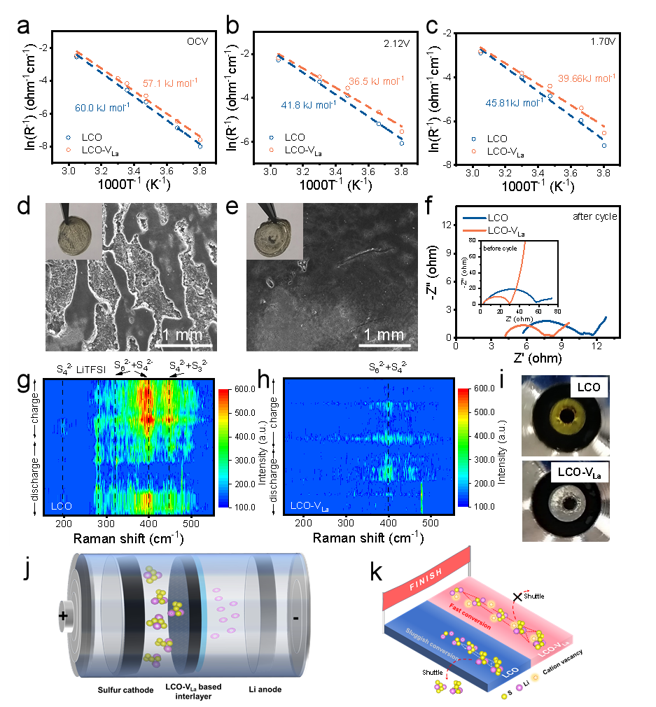 为了评估 LCO-VLa 对多硫化物转化动力学的影响,对不同充电状态 (SOC) 和温度范围(−10至55 °C)的电池进行了电化学阻抗谱分析。LCO-VLa 在整个充电和放电阶段表现出较低的活化能和电荷转移阻抗,表明氧化还原动力学增强,反应能垒降低。此外,将1.0 C循环 200次的电池拆解,以评估锂负极形貌和中间层的阻挡效果。LCO表面粗糙,锂沉积不均匀,有明显可见的凹坑,表明多硫化物穿梭到负极和造成锂负极的腐蚀。相比之下,LCO-VLa 表现出更光滑的锂负极表面,表明有效地阻断和催化转化多硫化物,提高了硫的利用率并保护了锂负极。循环前后的阻抗分析显示,LCO-VLa中的电荷转移阻抗降低,界面阻抗 (Rg) 也更小,表明与LCO相比,其电化学性能有所改善,多硫化物转化动力学增强。通过使用原位电化学Raman池,可以实时监测电池中的多硫化物形成和分解,有助于了解电池内部的情况。在基于 LCO的电池中,在充电和放电阶段都检测到了较高浓度的多硫化物,这表明多硫化物穿透了LCO中间层,向锂负极渗透,导致负极的腐蚀和钝化。相反,基于 LCO-VLa的电池表现出最弱的多硫化物信号,表明有效地实现了多硫化物的限域和转化。对循环后的锂金属表面形貌观察显示,LCO电池的锂金属呈淡黄色,而 LCO-VLa电池仍保持初始颜色。这种对比证实了LCO-VLa中间层可以有效地阻断和转化多硫化物,在高浓度多硫化物环境中保护锂金属负极。实验结果证明 LCO-VLa促进了反应动力学,展现了阳离子空位工程在优化储能材料性能方面的潜力。