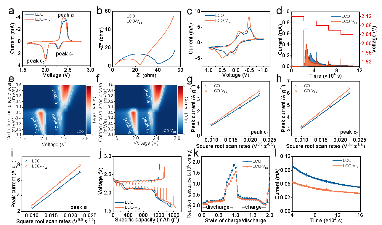 在一系列的电化学表征中,基于LCO-VLa的电池表现出较低的电荷转移阻抗(Rct)。同时LCO-VLa具有较低的起效电位,表明其将多硫化物转化为Li2S的能力更强。恒电位间歇滴定技术(PITT)分析表明,与LCO相比,LCO-VLa显示出更快的峰值电流响应、更高的峰值电流和更高的Li2S沉积容量。LCO-VLa在所有充放电阶段都表现出比LCO更高的Li+扩散系数,此外,恒电流间歇滴定技术(GITT)表明,与LCO相比,LCO-VLa贡献了更高的容量,在不同阶段具有较低的反应电阻。经过160,000秒,LCO-VLa表现出更小的穿梭电流,表明La空位有效抑制了穿梭效应。