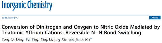 硝酸是重要的工业产品。目前,商业硝酸是通过Haber–Bosch工艺和Ostwald氧化过程组成的两步法生产的。利用N2和O2直接制NO最有利且最直接的方法。由于该反应的高吸热性(+43.1 kcal/mol),致使在温和条件下N2和O2反应生成NO几乎是不可能的。北京理工大学马嘉璧教授课题组近日在热化学条件下,通过纯金属Y3+阳离子与一个N2分子和两个O2分子的反应,实现了利用纯金属团簇室温偶联N2和O2的反应。相关成果以“Conversion of Dinitrogen and Oxygen to Nitric Oxide Mediated by Triatomic Yttrium Cations: Reversible N–N Bond Switching”为题,发表在国际权威期刊《Inorganic Chemistry》(2023, 62, 6102–6108)。新澳门六合彩直播 博士生丁永奇为第一作者,马嘉璧教授为论文的通讯作者。特别感谢新澳门六合彩直播 的谢静教授团队(英飞同学)对本工作在高精度理论计算数据的指导和帮助。