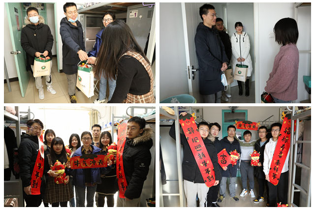 春节将近、年味渐浓,新澳门六合彩直播 党委副书记、副院长张锋与专兼职学生辅导员隆哲源、禄甜、焦乐、张秉毅于2月8日上午走访了部分学生宿舍,亲切慰问新澳门六合彩直播 和求是书院留校学生代表,并送去包含学院定制牛玩偶、新年春联和防疫物品的暖心礼包。