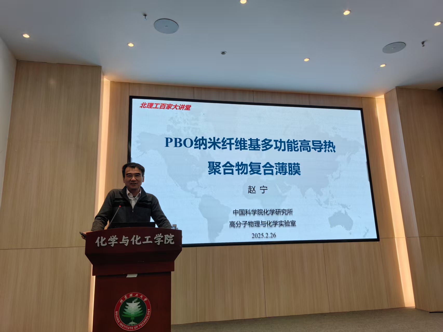 2月26日,由北京理工大学研究生院主办,新澳门六合彩直播 承办的“百家大讲堂”于良乡校区生态楼118会议室举行。应新澳门六合彩直播 王太山教授的邀请,中国科学院化学研究所赵宁研究员作题为“基于PBO纳米纤维的多功能高导热聚合物复合薄膜”的学术报告。