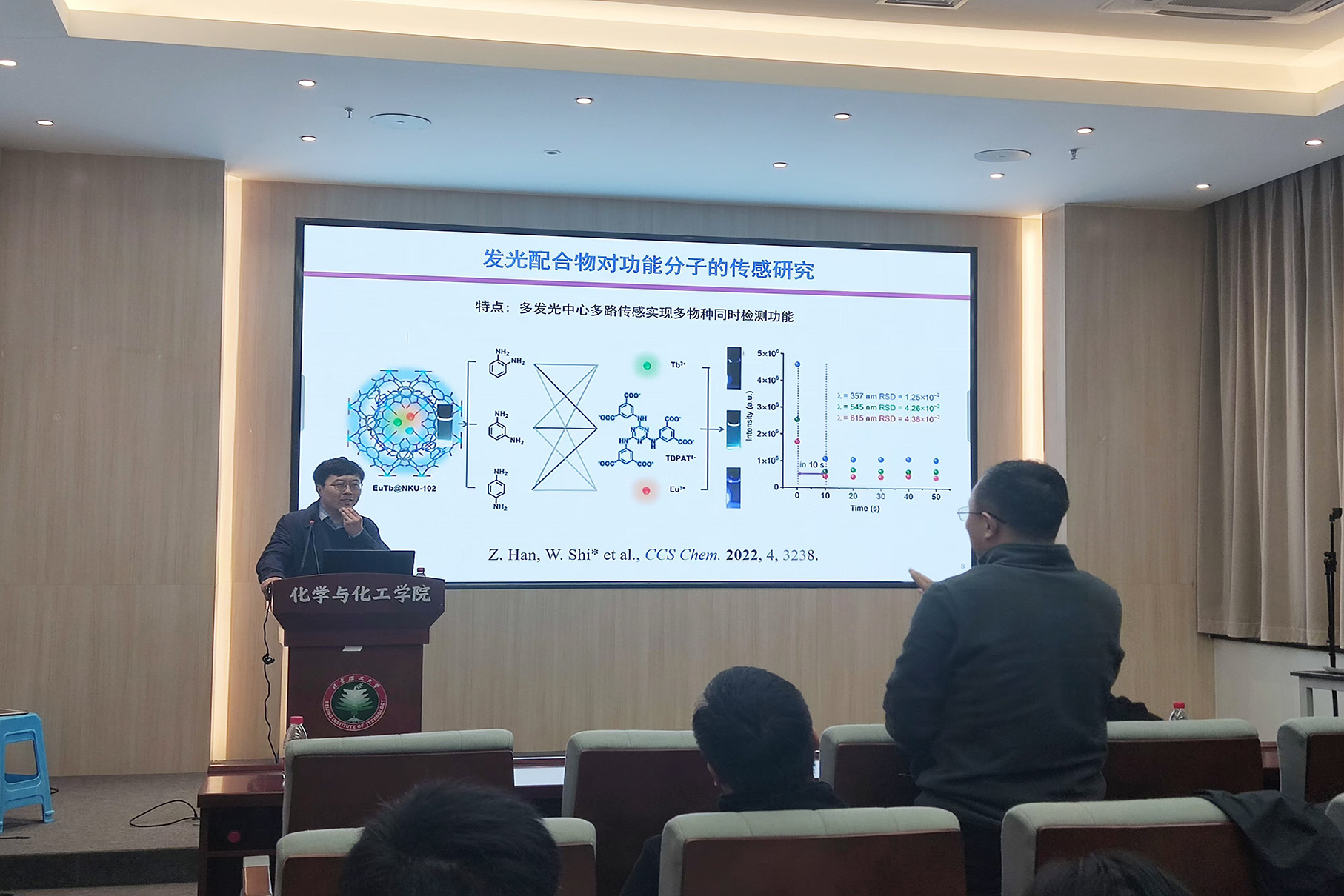 报告会上师教授主要围绕配合物的结构设计与功能调控,深入分析了多组分动态发光配合物的高效合成、分子和能级结构,并探讨了在外界刺激下其性质变化规律。报告内容主要包括以下几个方面:(1) 发展了一系列新型多中心功能配合物,阐述了通过精确调控多个关键体系组成和微孔结构,所获得配合物的合成规律和结构特征,为配合物的结构设计提供了新的思路和方法;(2) 探讨了多中心动态发光配合物作为高效传感材料的应用前景,通过构效关系的系统分析,揭示了不同结构单元之间的相互作用及其对材料性能的影响。