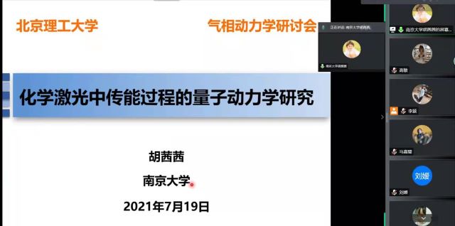 应新澳门六合彩直播 马嘉璧副教授邀请,中科院大连化物所袁开军研究员、南开大学张新星研究员、南京大学胡茜茜副教授、重庆大学勾茜教授于2021年7月19日上午8:30在腾讯会议线上分别作了题为“基于大连光源的水分子光化学研究” 、“气液界面化学动力学” 、“化学激光中传能过程的量子动力学研究” 、 “Rethinking π Interactions: Rotational stories”的精彩学术报告。报告由马嘉璧副教授主持,谢静教授及几十名同学参加了此次报告会。