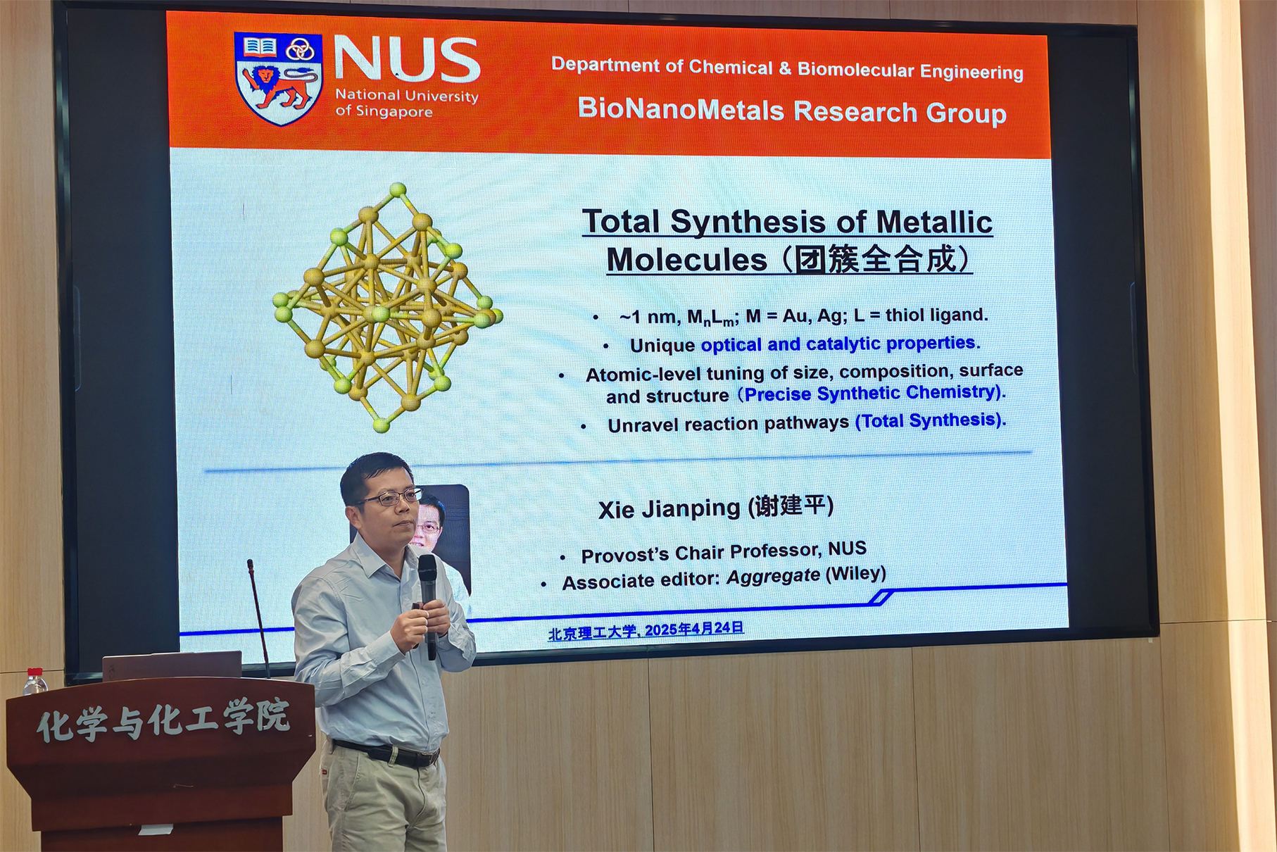 应新澳门六合彩直播 邀请,新加坡国立大学Jianping Xie教授于2025年4月24日做客北理工“百家大讲堂”学术报告,为我院广大师生带来题为“Total Synthesis of Metallic Molecules”的精彩学术报告。本次报告在生态楼118报告厅举行,由张加涛教授主持,近六十名化院师生参加了报告。